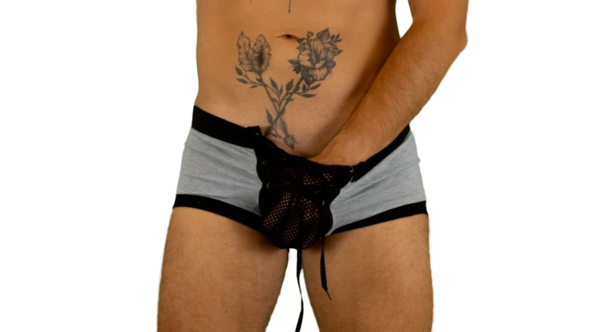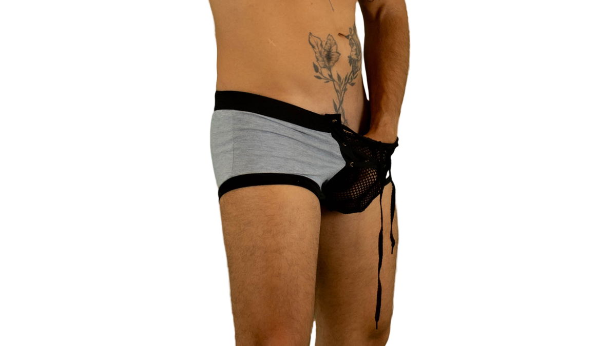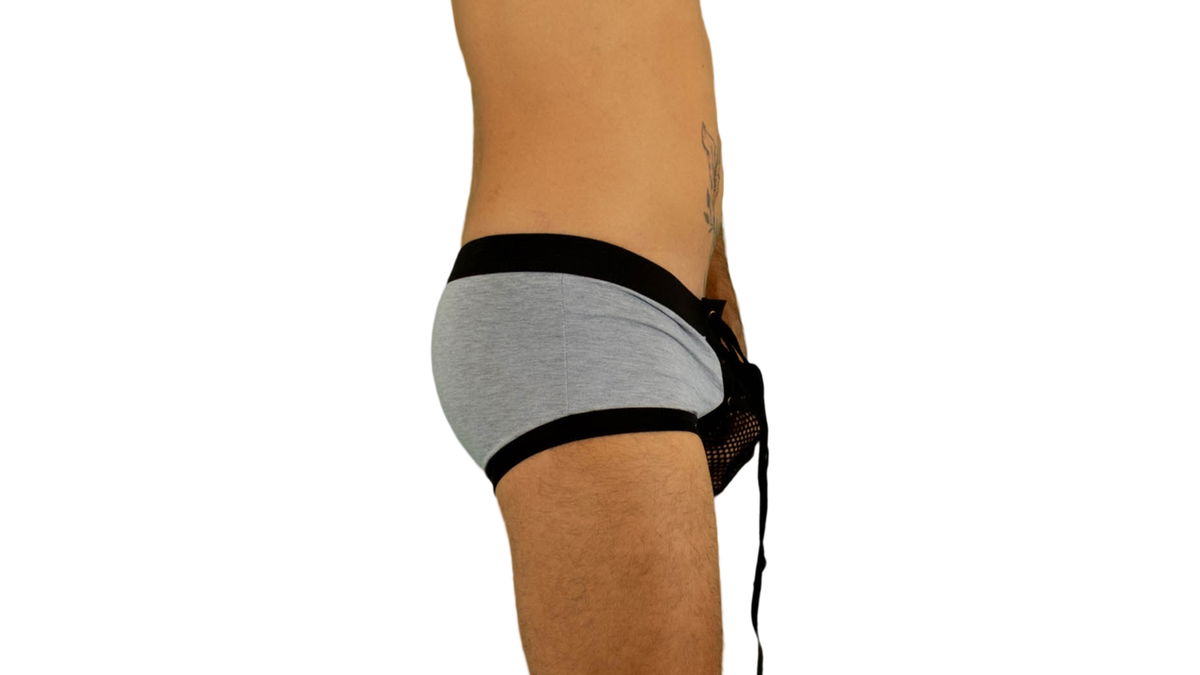 Calzoncillo brief gris con cordón negro y elástico negro, super ajustable en la parte frontal anatómico y de calce perfecto, ideal para momentos especiales donde sobran las palabra